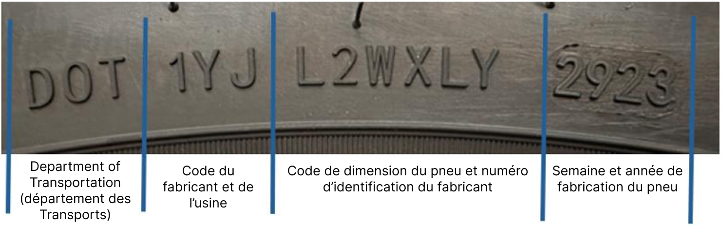 La date de fabrication du pneu est déterminée par les quatre derniers chiffres du numéro de série DOT imprimé sur le flanc du pneu, qui indique la semaine de fabrication du pneu pour une année donnée. Par exemple, un numéro DOT se terminant par « 2923 » indique la 29e semaine de 2023.